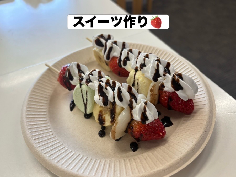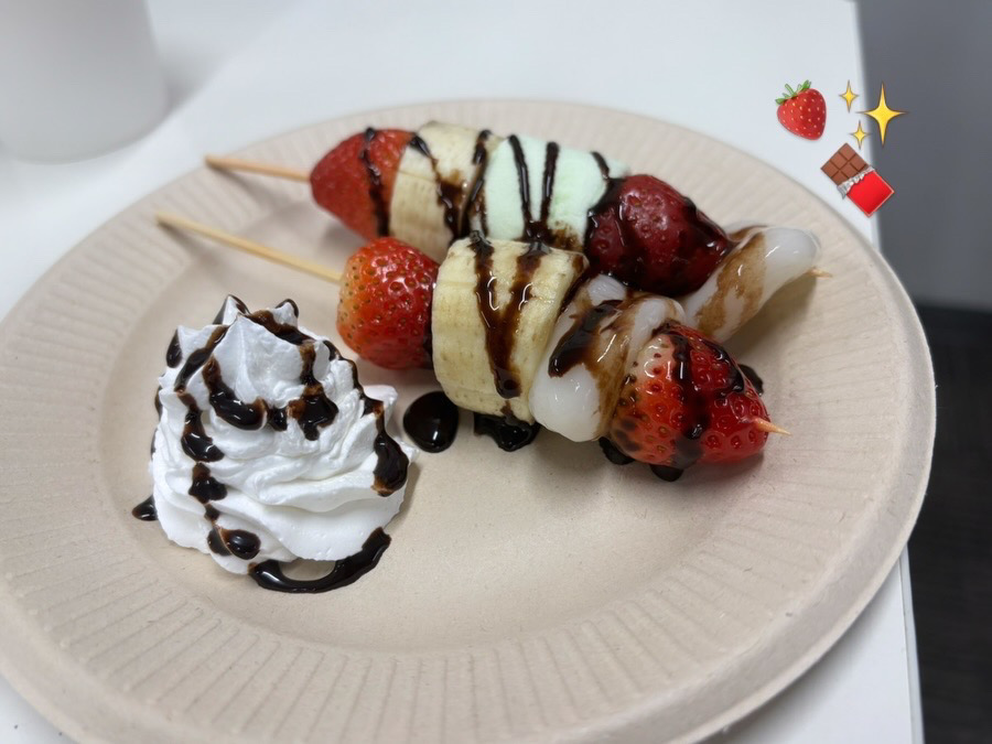 「どんな組み合わせにしよう?」「それ美味しそうですね!」と、自然と会話も弾みながら、色とりどりのスイーツ串が完成しました