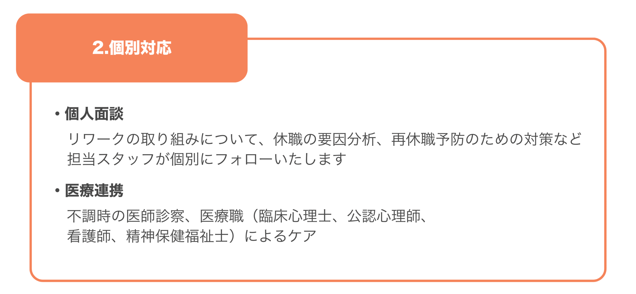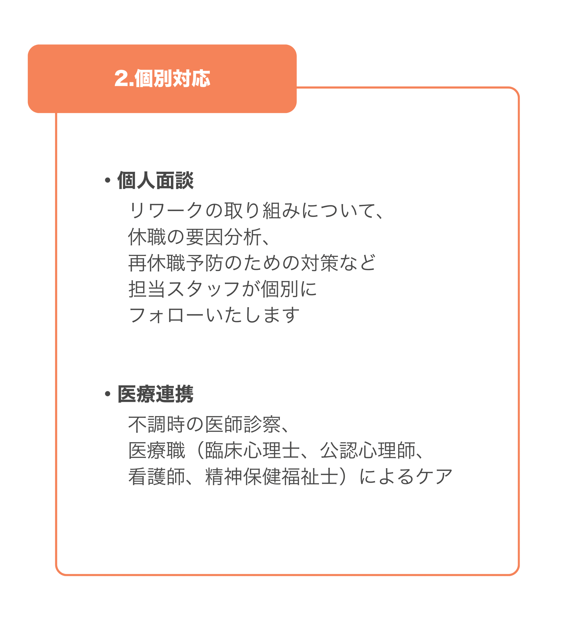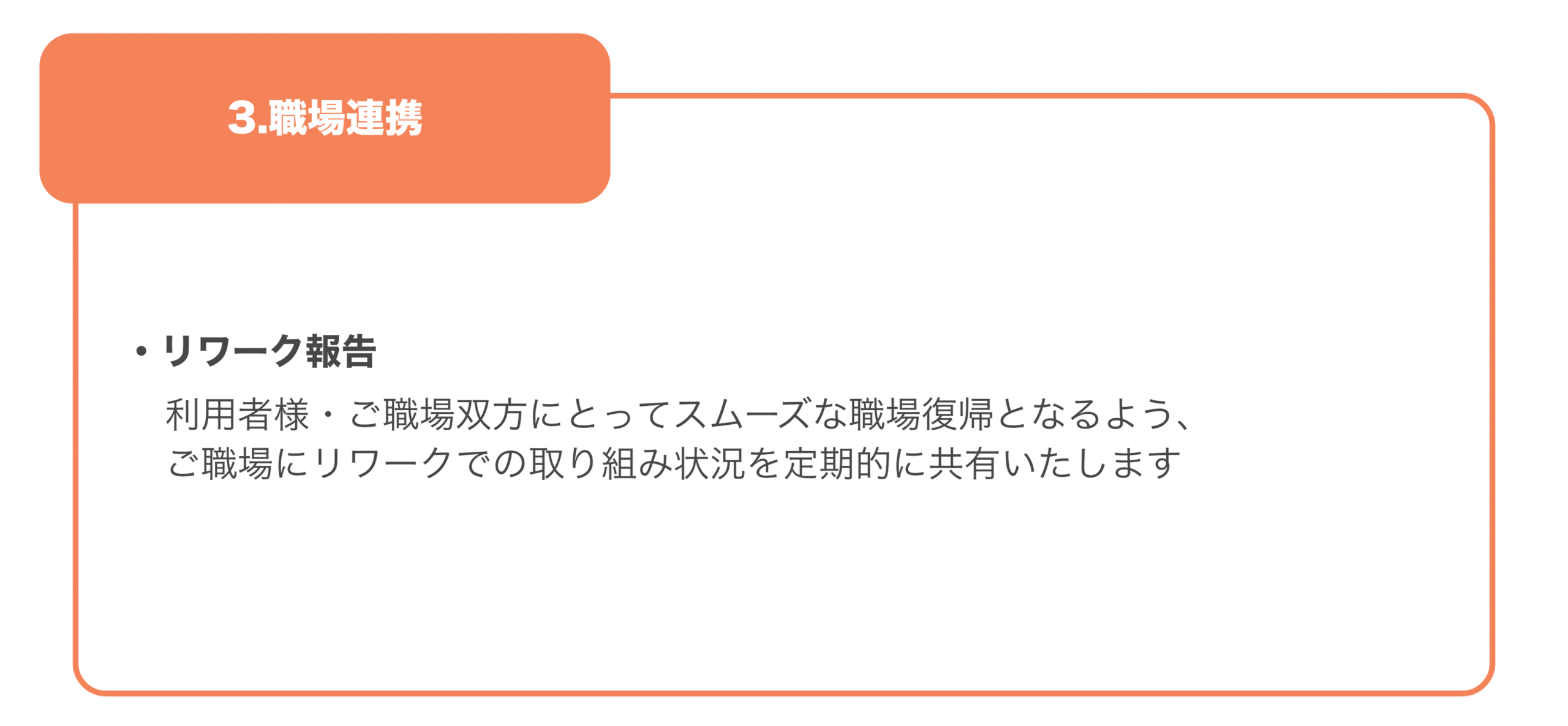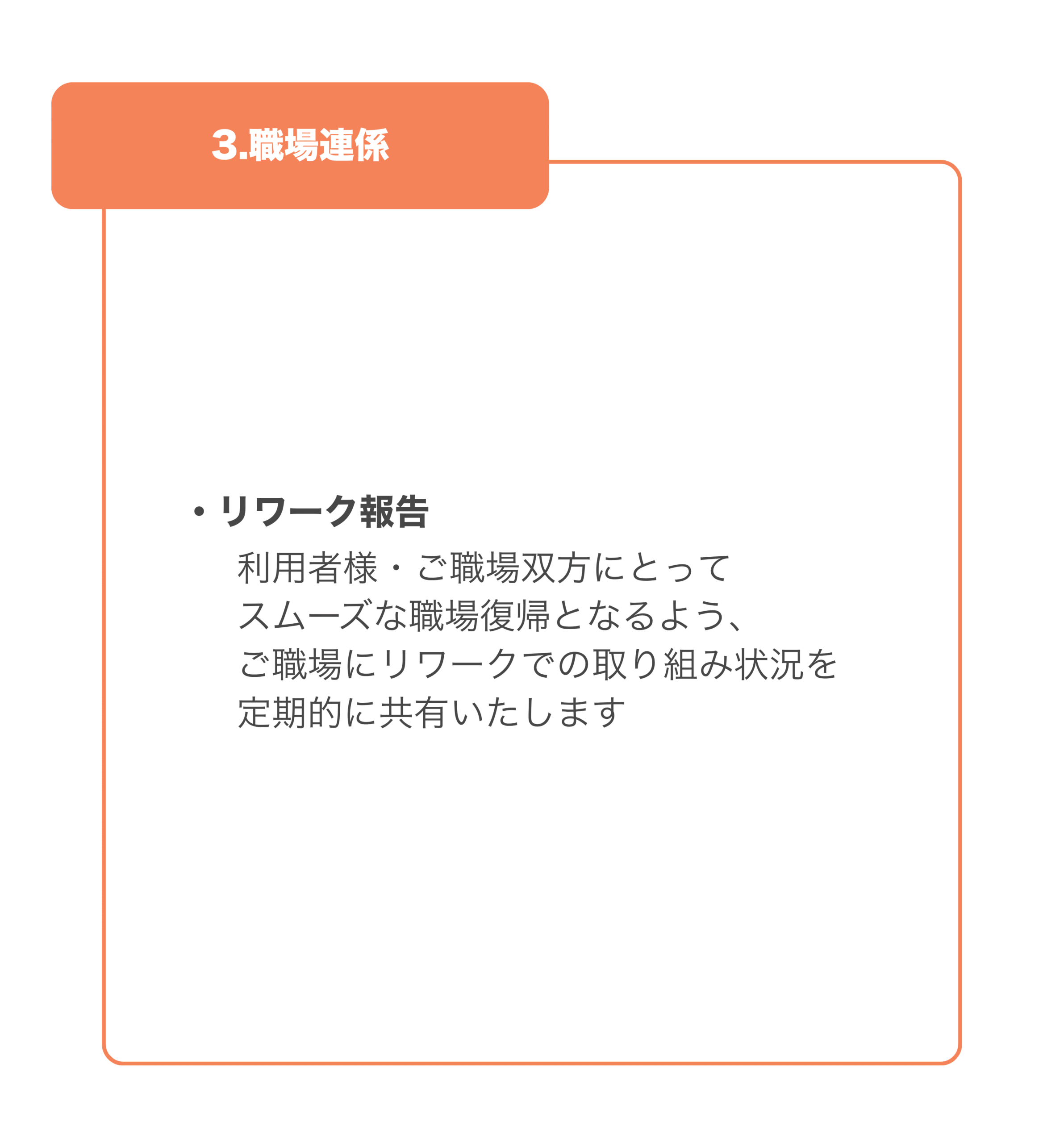 その復職までの道のりを、私たちが支援いたします。ひとりで悩まず、一緒に進めていきましょう。